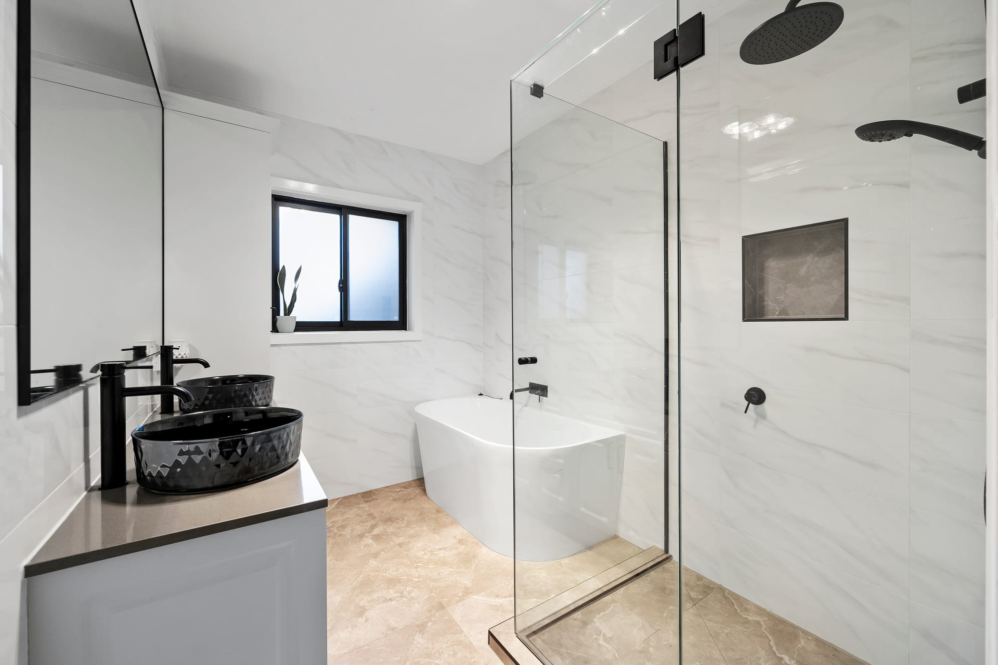 The stunning family bathroom includes a large walk-in shower, freestanding bath and a double vanity.