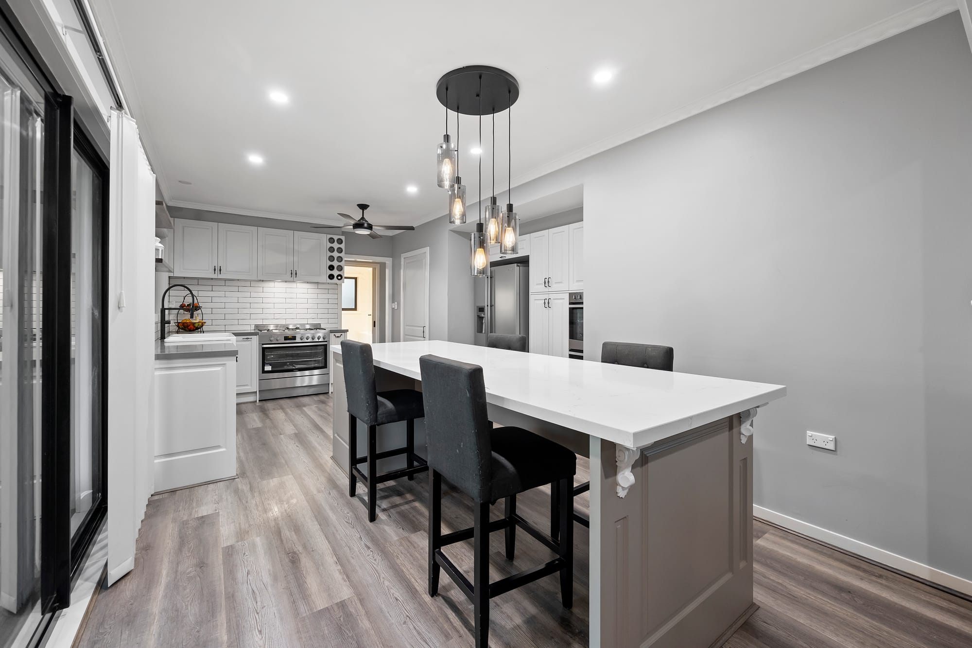 The gorgeous modern kitchen features stunning stone benchtops, a long breakfast bar, updated appliances including a dual stove, electric wall oven, dishwasher plus a walk-in pantry.