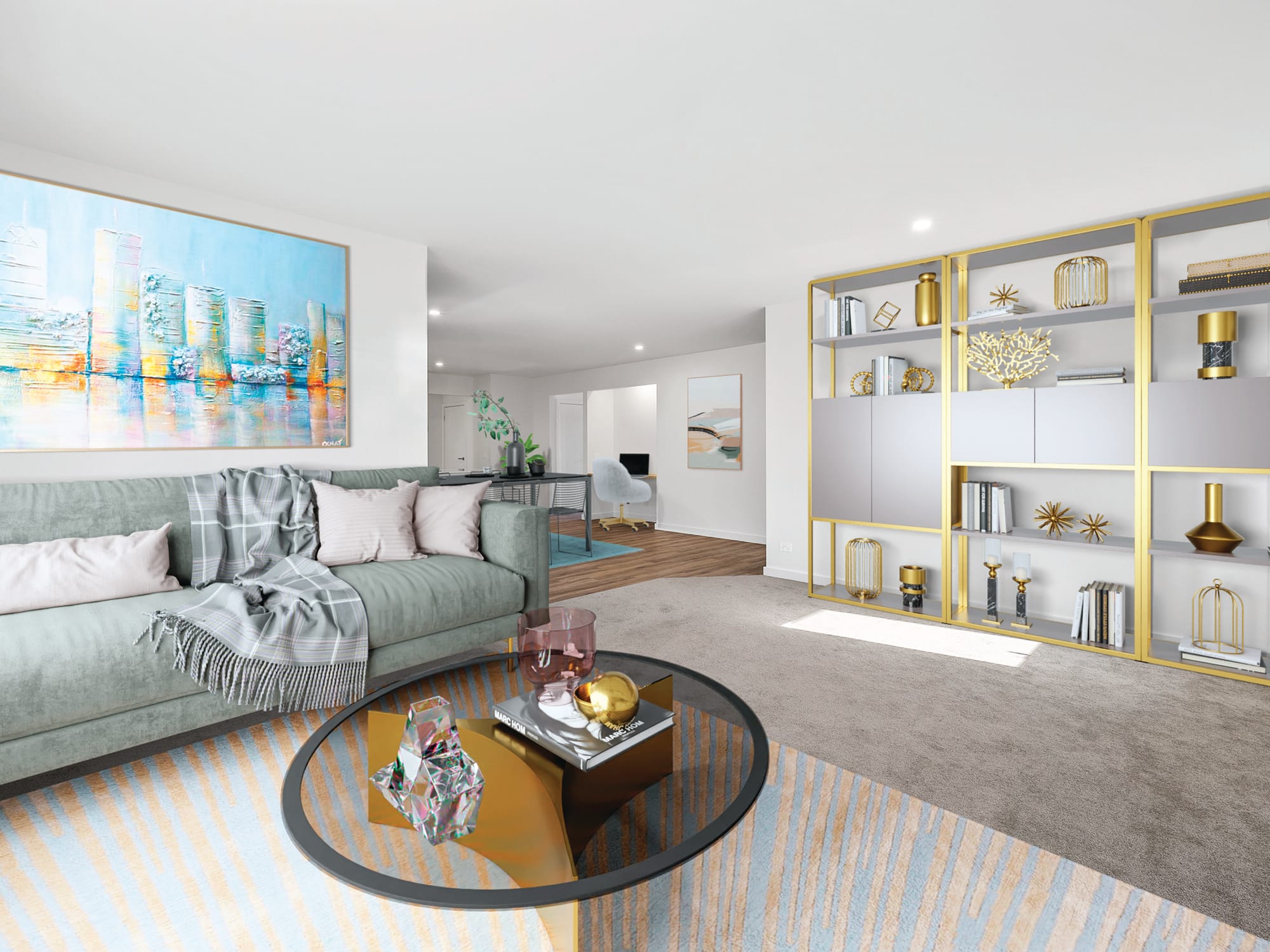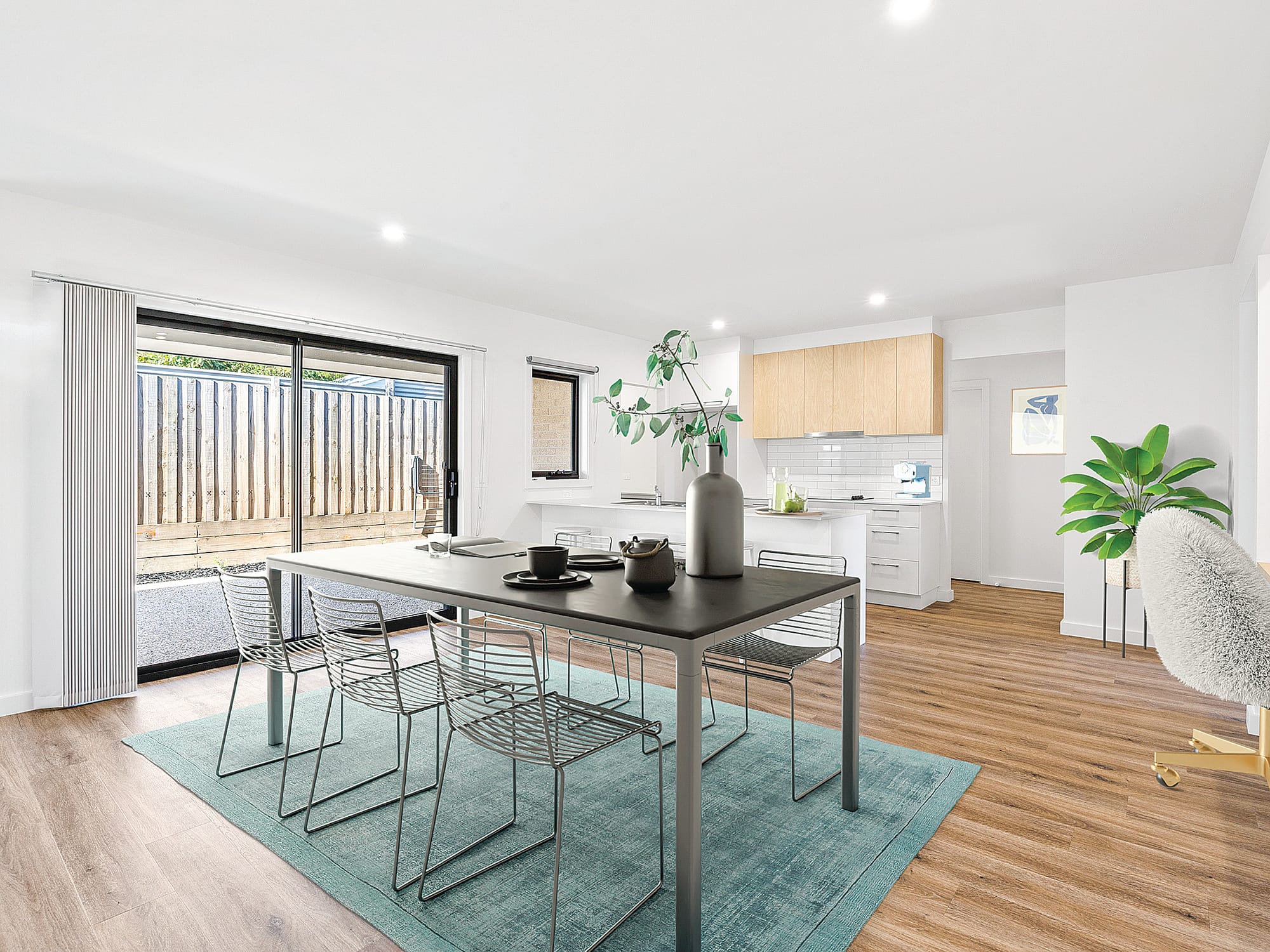 The open plan living and dining presents style with tasteful neutral tones, and a sun filled space complemented by chic timber and carpet flooring.