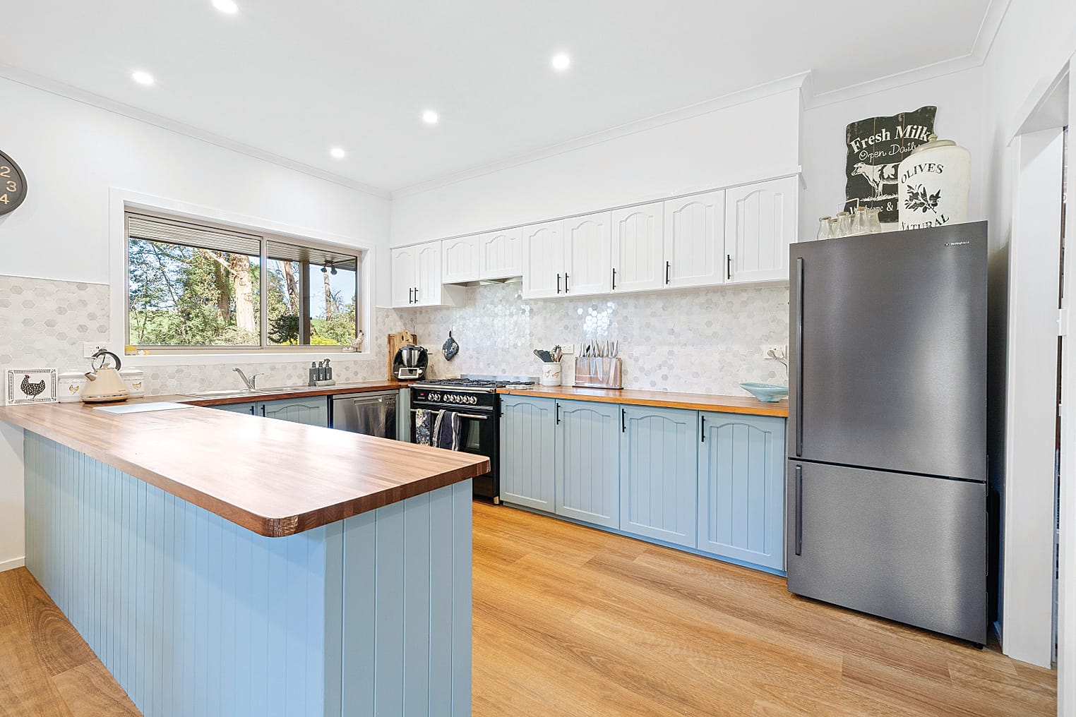 • The kitchen has a large 900mm oven with a silent range hood overhead and a gas cooktop. A huge walk-in pantry and loads of storage throughout the entire kitchen.