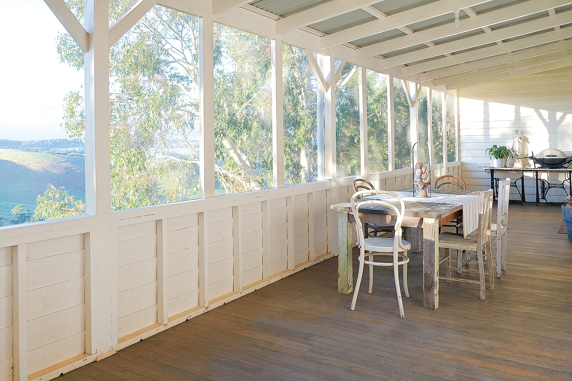 This charming country home combines classic elegance with modern comfort. Featuring timeless timber beams and stunning hardwood floors, the spacious master bedroom includes a walk-in robe and semi-ensuite, while additional bedrooms and a study are thoughtfully situated upstairs. A private guest room with its own ensuite is accessible via a separate entrance, ensuring privacy for visitors. Enjoy cosy warmth from the Cheminee Philippe wood convection heater or gas space heater. The expansive wrap-around verandah offers panoramic views of the rolling landscape, complemented by the spacious “Coolgardie” outdoor living room. Additionally, a versatile two-bedroom studio awaits, ideal for guests, extended family, or as a creative workspace.