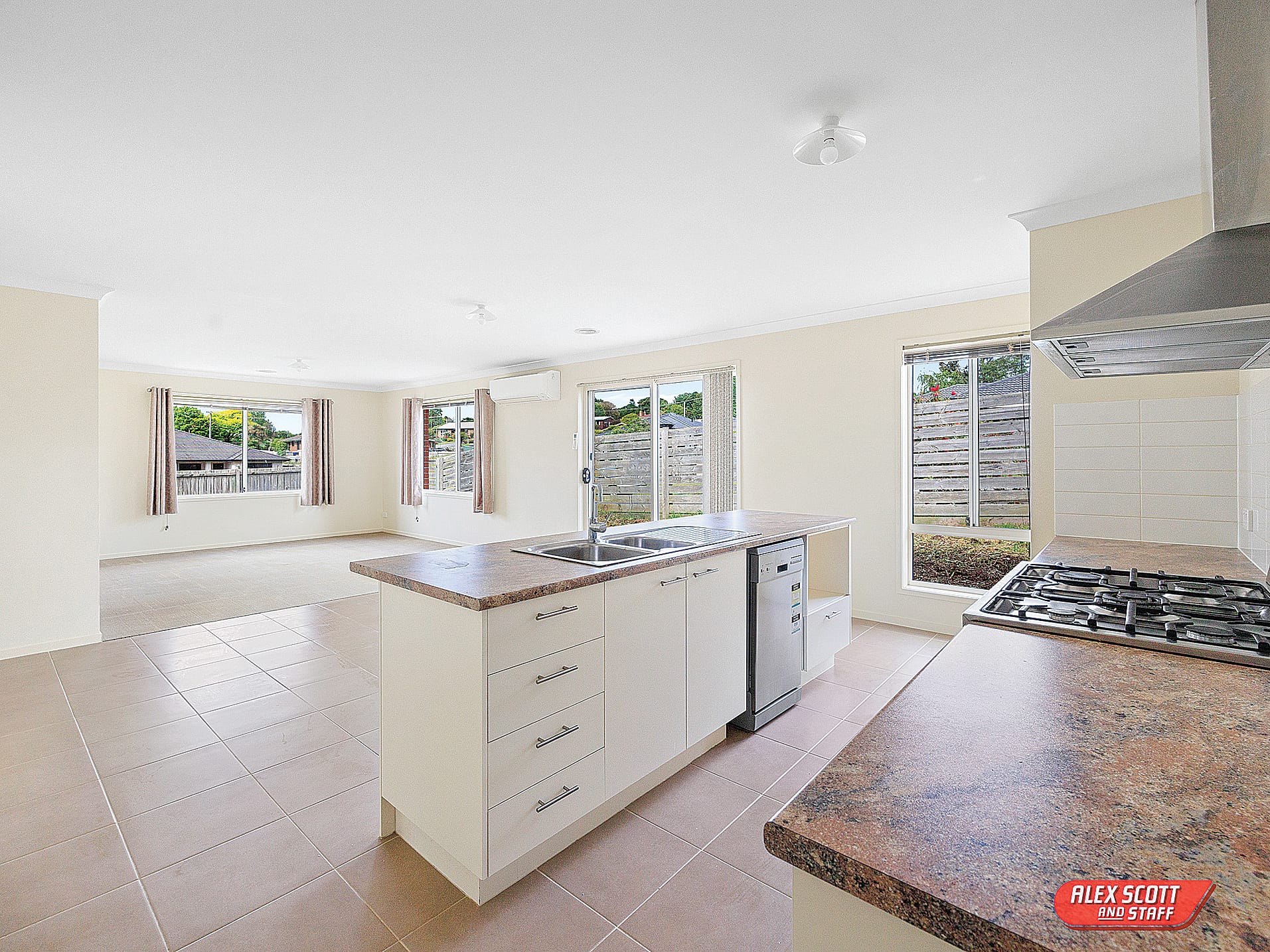 An open plan kitchen, dining and living area are naturally lit and overlook the secure back yard.