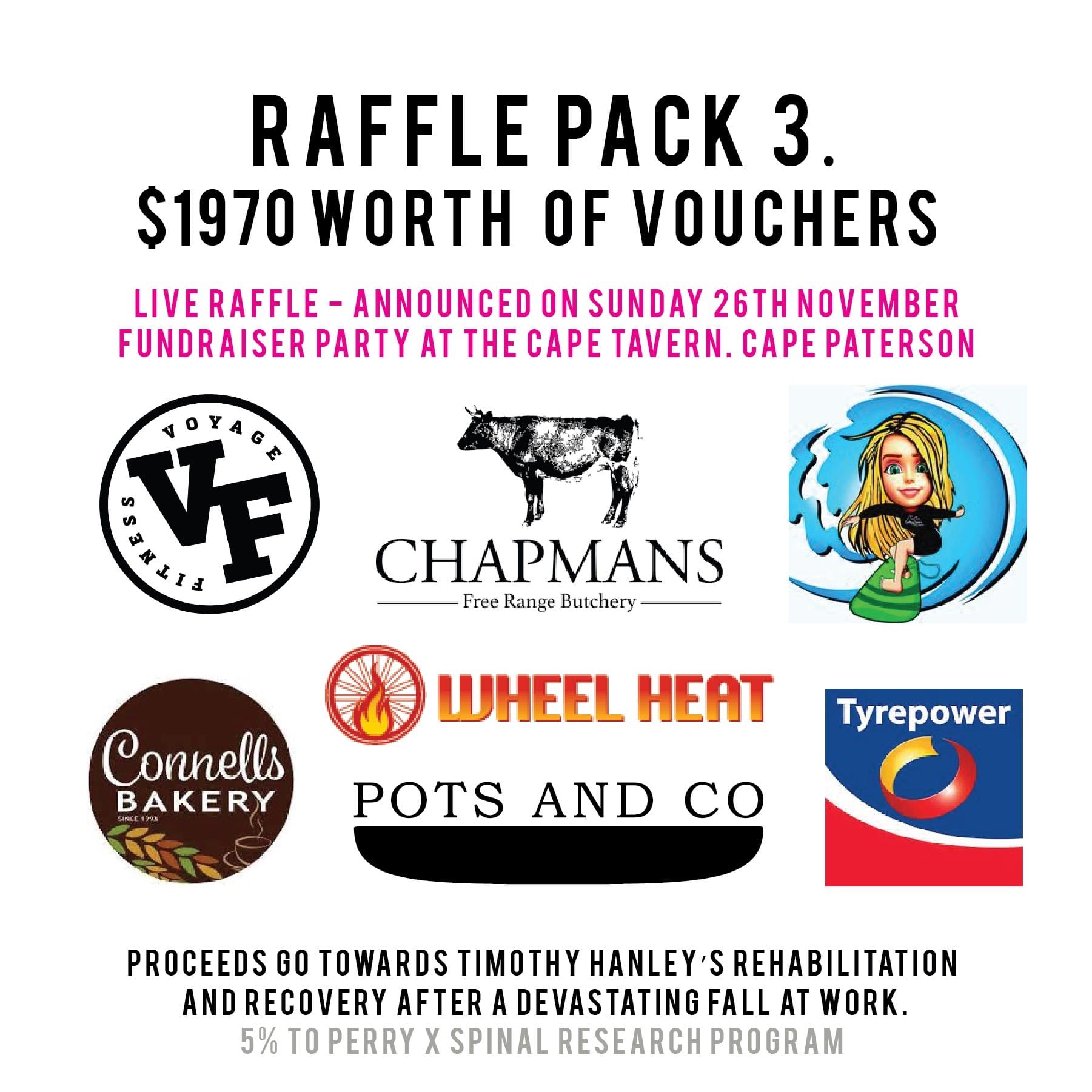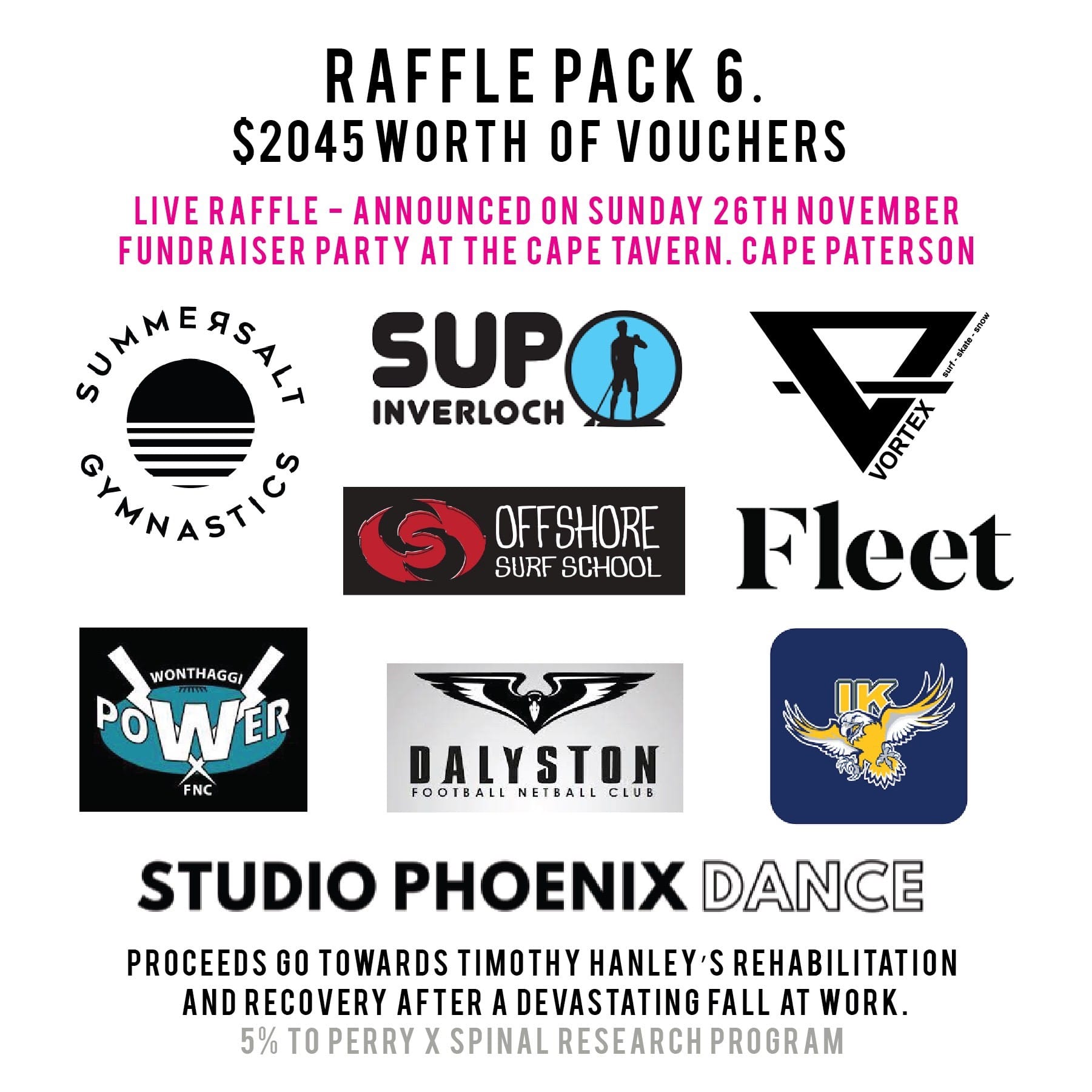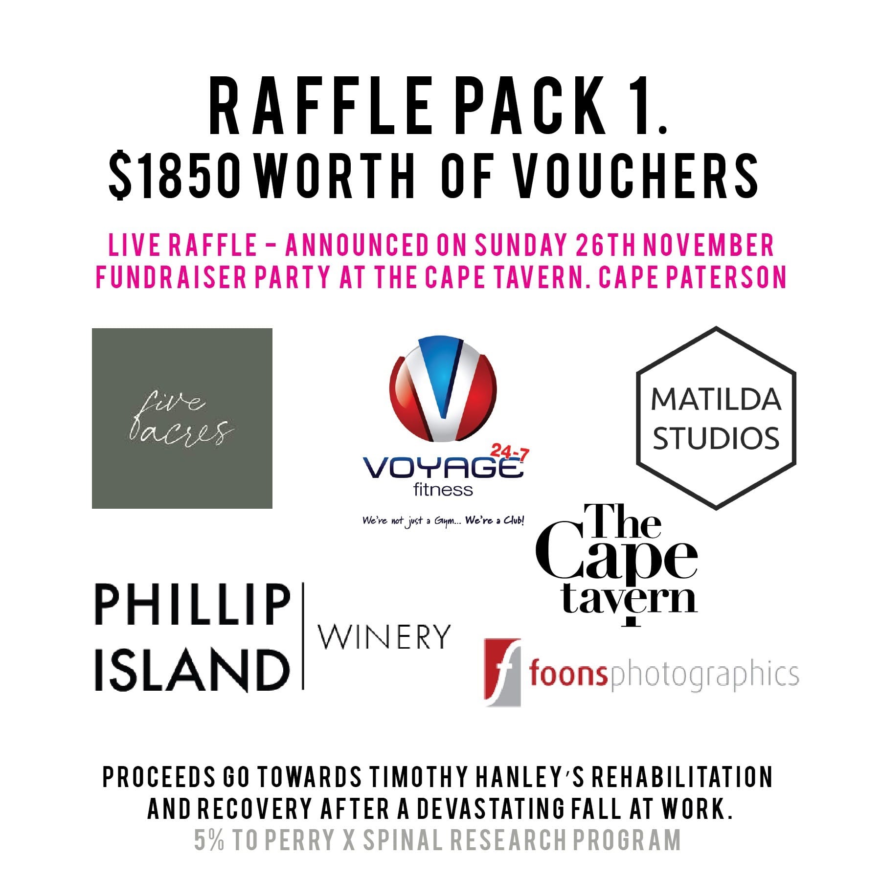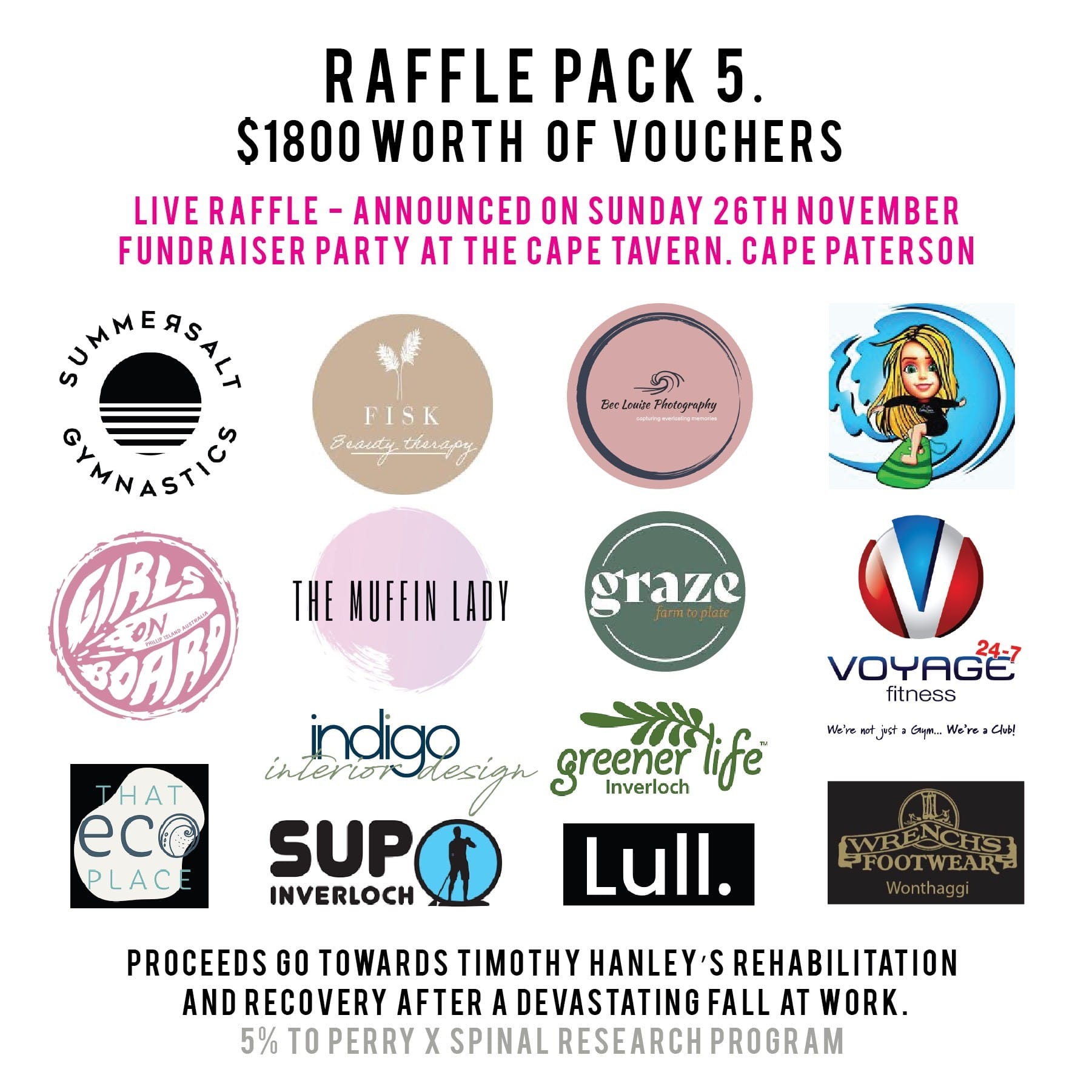 Over 80 businesses have supported Tim’s Road to Recovery by generously donating to the numerous raffles that will be drawn on the night, including the major raffle prize that will be announced at the sister fundraising event held at the Common People Brewery on December 2 in Bangalow NSW – Tim’s new local town.