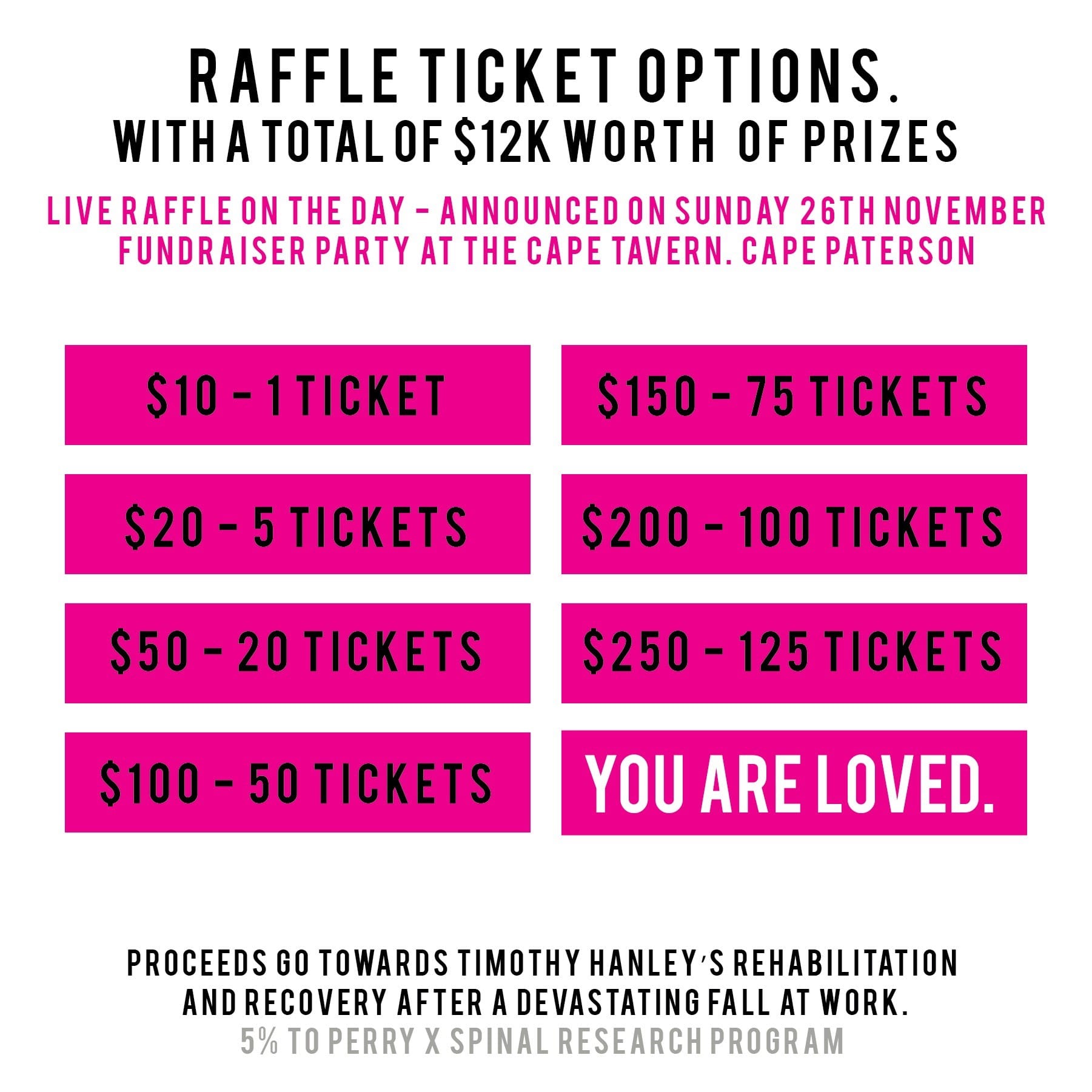 Raffle tickets are now available for @timmys_road_to_recovery with six raffle prize packs to be won.
