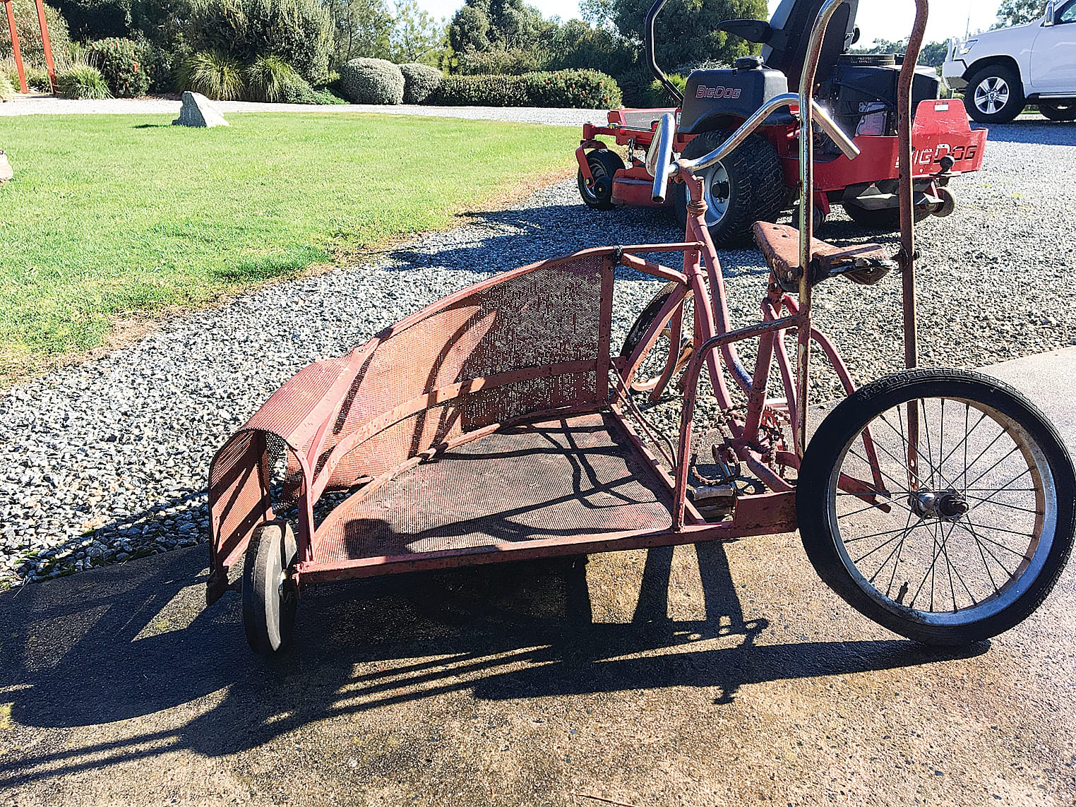 The restoration process was for Max both fun and a challenge. The project was a window to the country children who must have spent many happy hours whizzing around the farm and a nod to the probable fond parent or grandparent who dreamed up such an original bicycle. Or is it a tricycle?