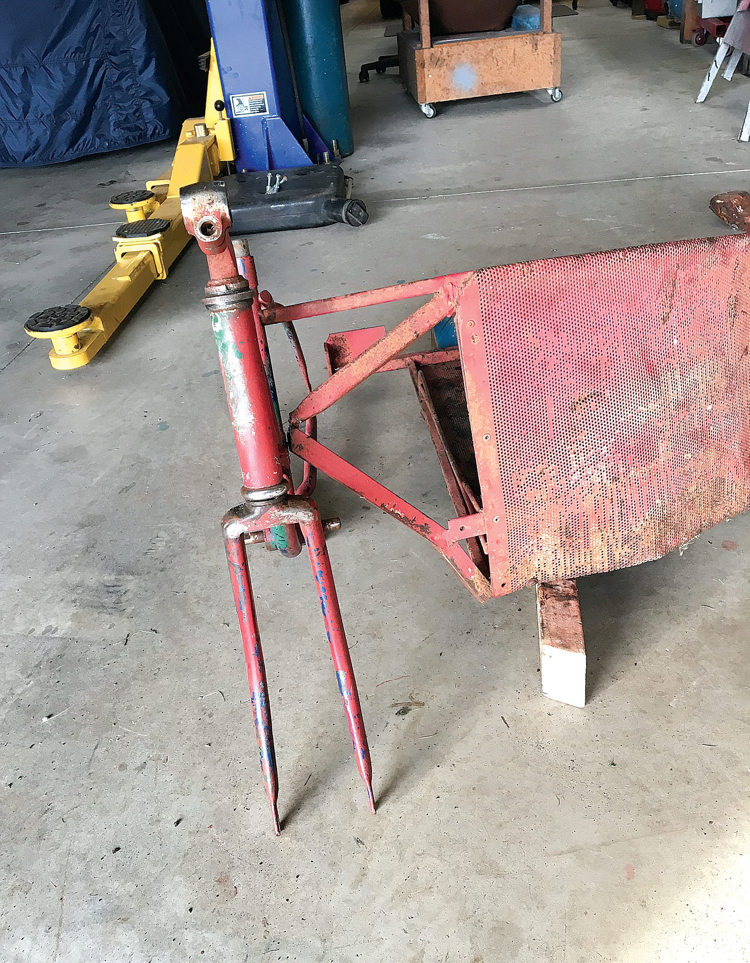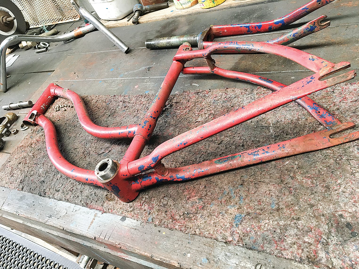 The chariot frame had to be cut from the bike so the restoration could begin. The steering and pedals were completely seized and there was surface rust all over.