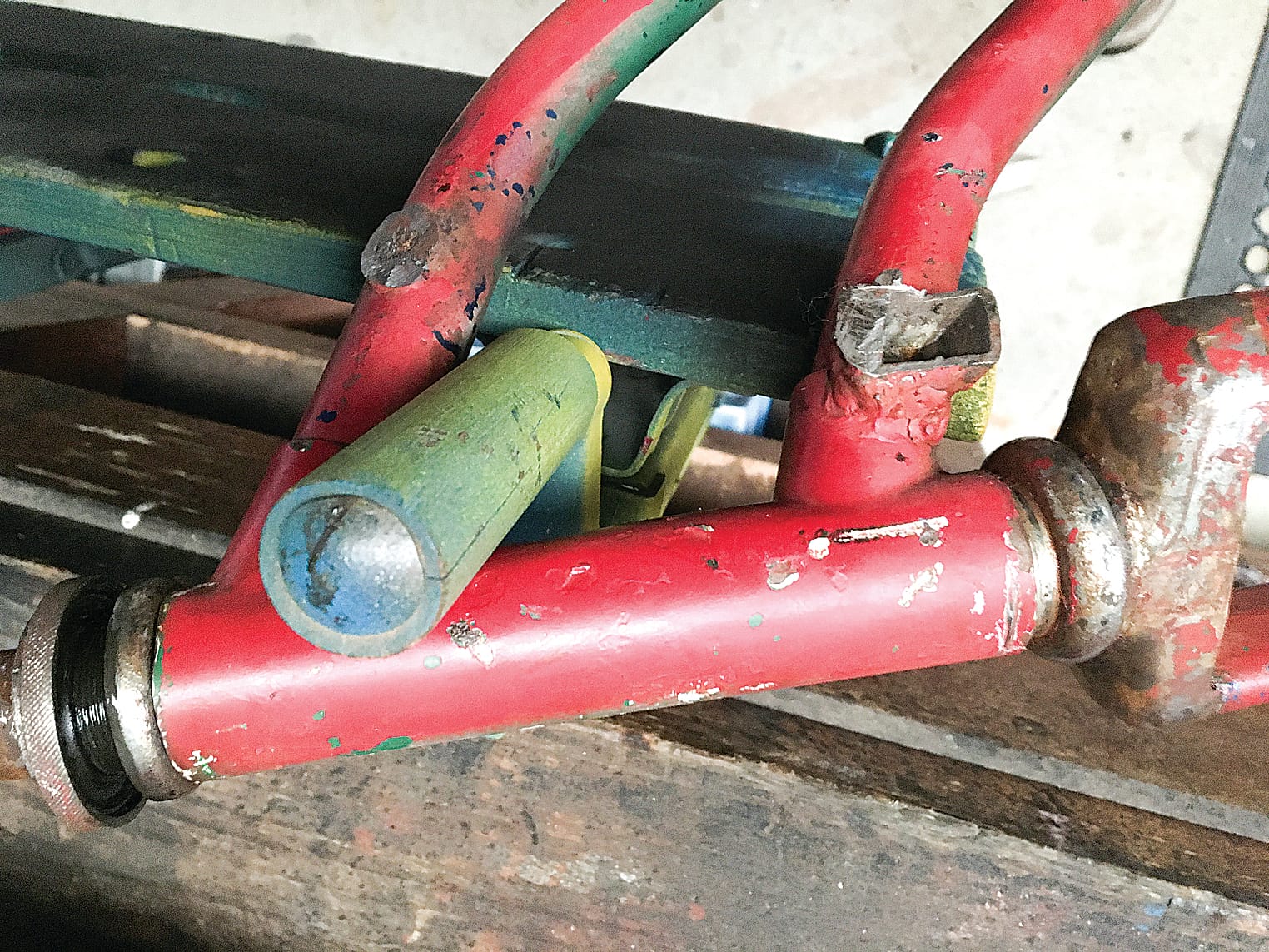 With the bicycle starting to take shape again it was primed, and a family debate took place on the important question of choosing a paint colour. BP-green won out for the topcoat.