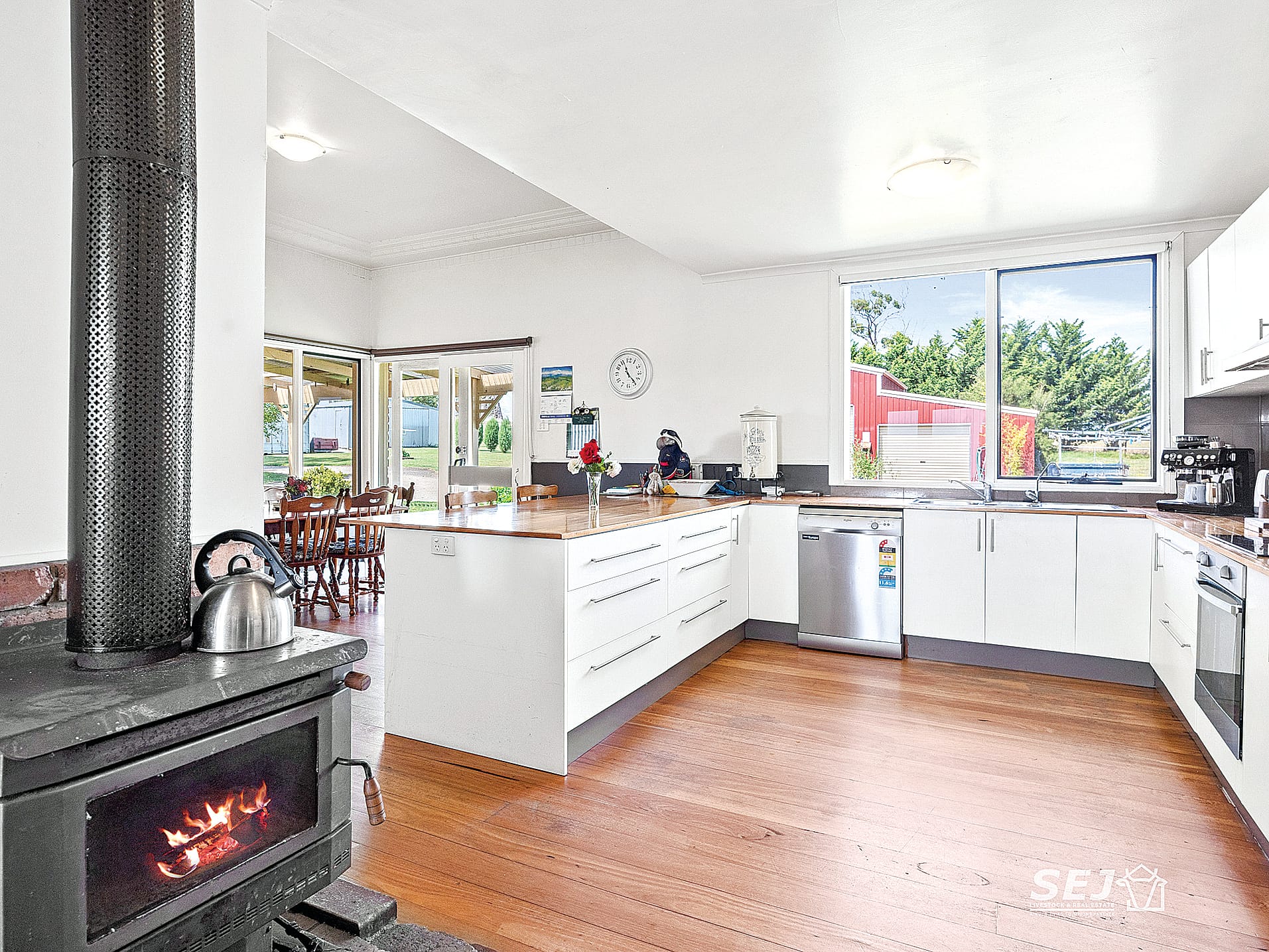 • The kitchen features hard wood timber bench tops, electric cooking, dishwasher, and solid fuel wood heater