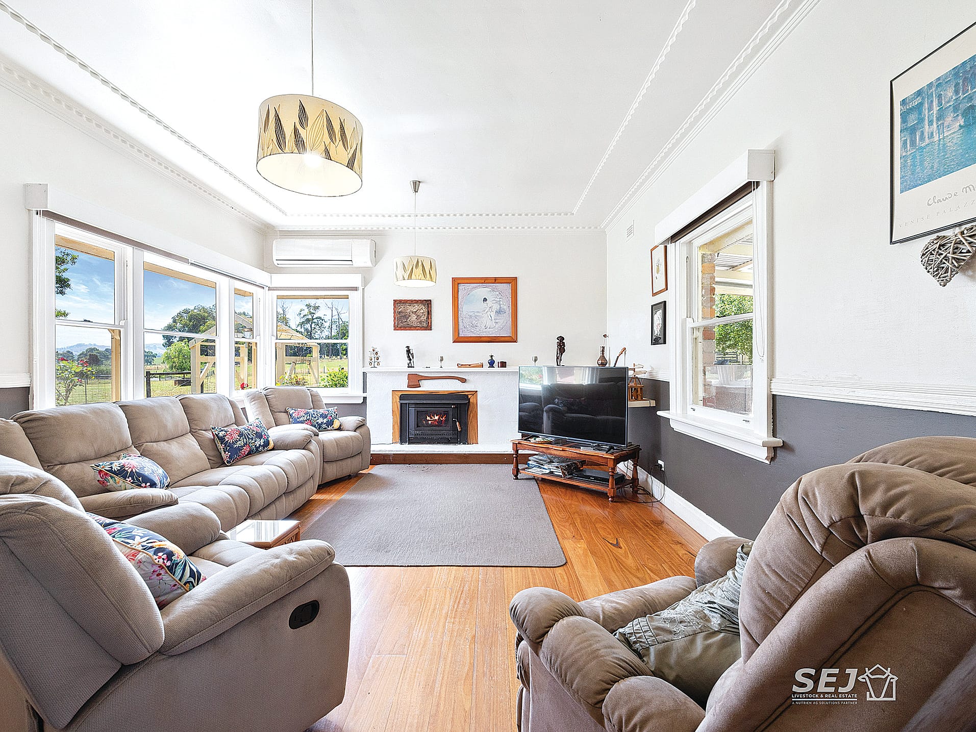 • The living room is spacious with solid fuel heater and reverse cycle air conditioner (two) with lovely views across the valley