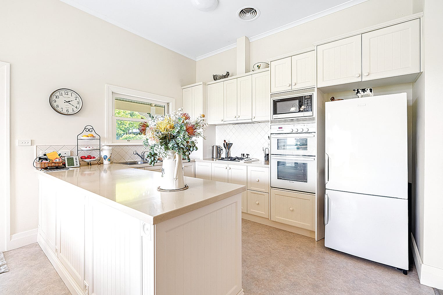 Showcasing all the hallmarks of its era, the home features soaring 10ft ceilings, ornate cornices and double-glazed windows adorned with ornamental awnings. Freshly painted on the exterior, it welcomes you with a bullnose verandah that perfectly frames the stunning outlook. Inside, the open-plan kitchen, living and dining zone creates a warm and inviting heart of the home, enhanced by a gas log heater and sliding doors that flow to the verandah for easy indoor-outdoor living. The kitchen impresses with Caesarstone benchtops, a double farmhouse sink, electric double oven with built-in microwave and gas cooktop.