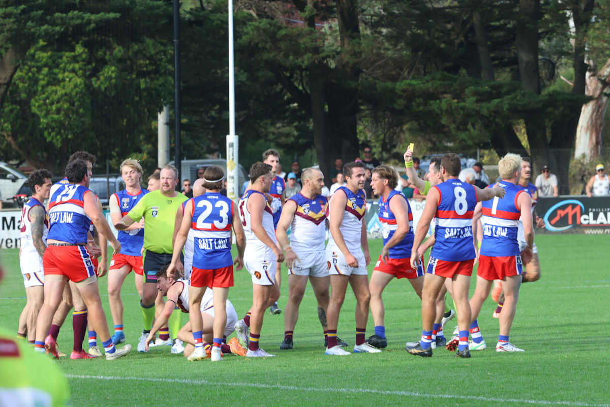 There’s little doubt this feature event of the Phillip Island Bulldogs’ season was a raging financial success and it looked set to be a thrilling triumph on the field as well when the Island’s coach Cam Pedersen accepted a soft pass from Hayden Bruce after good lead up work by his brother Charlie and stretched the lead to 13 points at the 22-minute mark.