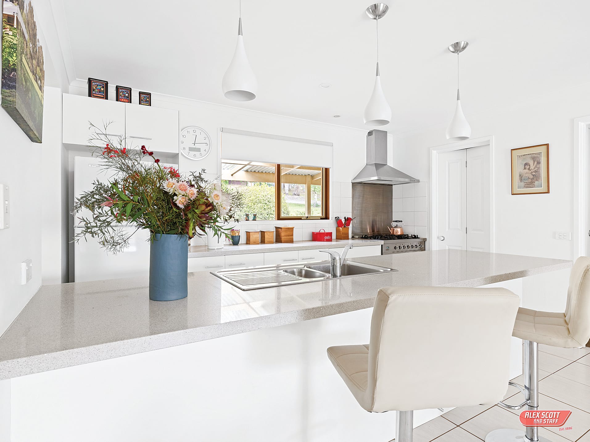 Step inside, and you’ll find an open-plan living space designed for comfort and connection. Bright, airy, and spacious, the interior offers seamless flow and functionality. The well-appointed kitchen is a centrepiece, featuring a breakfast bar, walk-in pantry, 900mm stainless steel gas cooktop with an electric oven, a stainless-steel range hood, a dishwasher, and a generous meal preparation area.