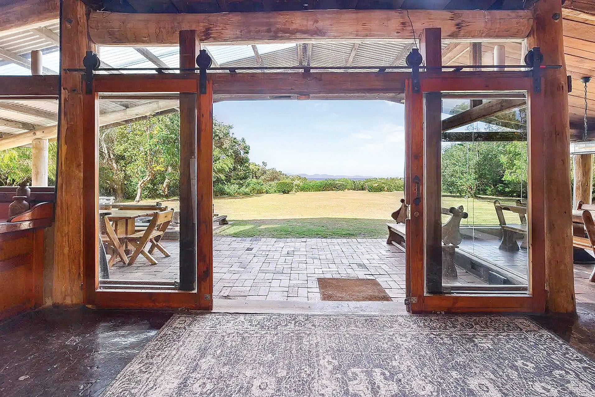 In keeping with the coastal surrounds, the spacious barn-style ‘Wirrega’ lodge was fashioned from recycled materials constructed using hand-adzed timber beams and weathered poles that date back a century or more. Walls are constructed of mud brick using a slurry of ochre and applied using a variation of the wattle-and-daub technique used in pioneering times that, as a result, has imparted a wonderful rustic warm finish.