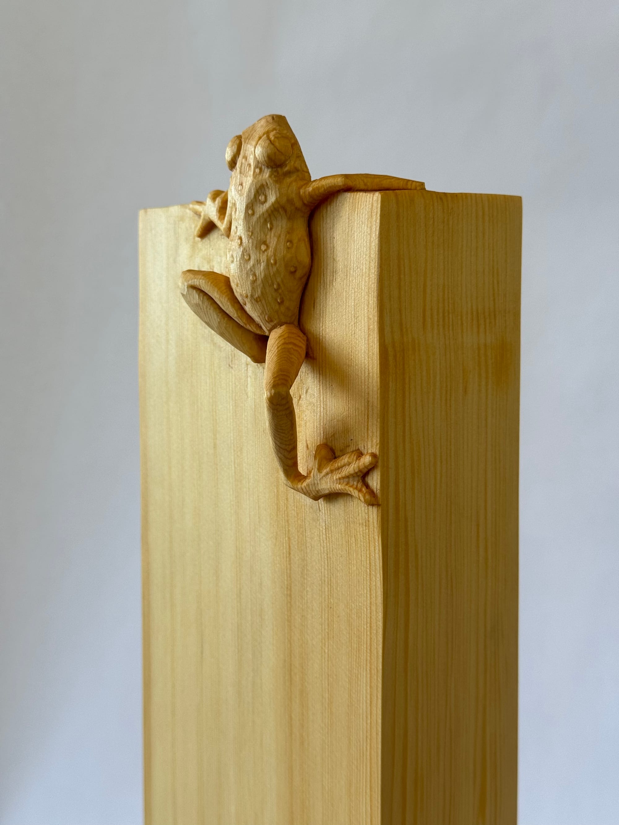 Little Frog. Big Climb depicts a small frog mid-ascent, captured in a moment of quiet determination. Carved in a single piece of Huon Pine, by hand using traditional reductive techniques, the sculpture allows the natural grain and character of the timber to remain visible.