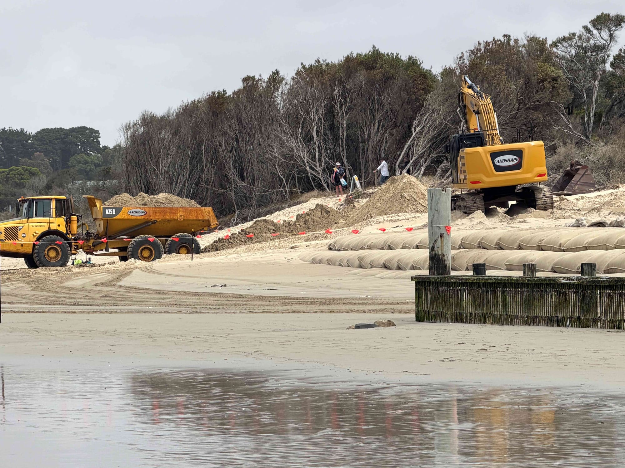 Workers say it will take about a month to complete the sandbag wall extension by which time the main dune reconstruction work will have commenced, dredging upwards of 110,000 cubic metres of sand from Anderson Inlet and depositing along degraded sections of the dune system.