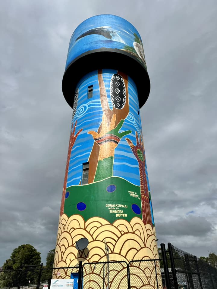 “The top of the tower was designed by local artist and filmmaker, Wayne Tindall. The base reflects Gunaikurnai history and stories, and was designed by Gunaikurnai Elder, Sandra Patten, and can be seen from all corners of Yarram.