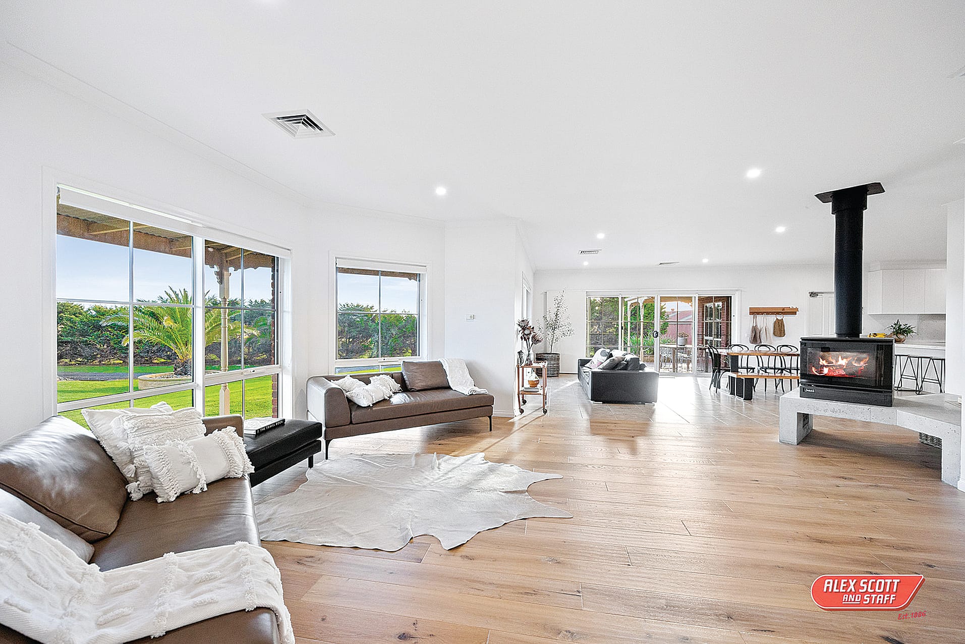 The living area is kept cosy with a Jindara dual glass wood fire that opens to the lounge and kitchen area.