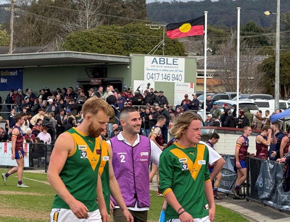 Leongatha Parrots’ debutants Finn Donohue and Mitch de Kleuver lead the senior team back to the rooms after a famous victory at Moe on Saturday, their efforts and those of their teammates appreciated by Yakka Bolge and the big contingent of Parrots’ supporters at the game.